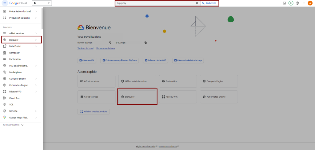 Une fois connecté·e, l’interface BigQuery sera accessible depuis :