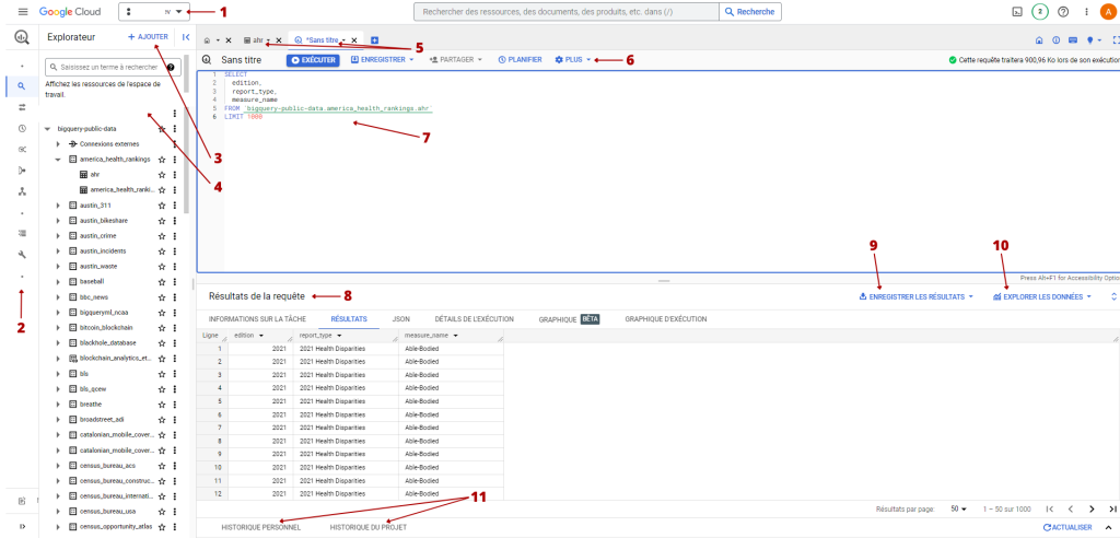 - Le bouton de création de table à partir d’un fichier local, de connecteurs internes ou externes, de datasets publics (cf. 3)