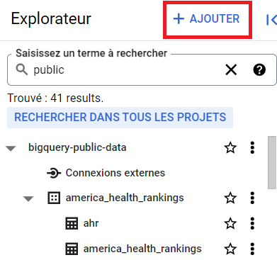 Information utile : des jeux de données publiques sont mis à disposition sur BigQuery. Pour y accéder, tapez “public” dans la barre de recherche de l’explorateur. Si le projet “bigquery-public-data” n’apparait pas, cliquez sur le bouton “RECHERCHER DANS TOUS LES PROJETS”.
