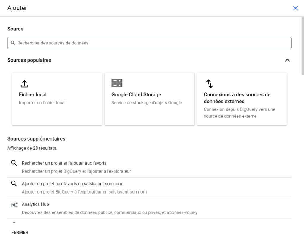 Comme précisé dans la partie Organisation, il est nécessaire de créer un ensemble de données avant de créer une ou plusieurs table(s). Une fois crée, l’une des options pour créer une table est de cliquer sur le bouton “AJOUTER”, situé en haut à droite de l’explorateur.