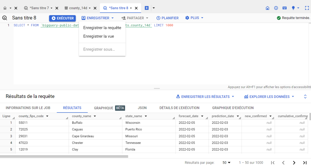 Les données résultant d’une requête peuvent être exportées via le panneau des “Résultats de la requête” (partie inférieure de BiqQuery Studio). Le bouton “ENREGISTRER LES RÉSULTATS” permet un export des données dans plusieurs formats.