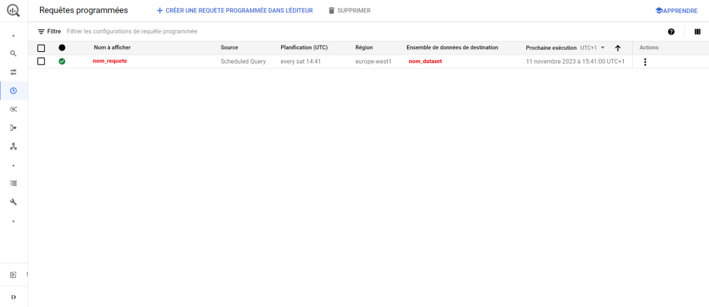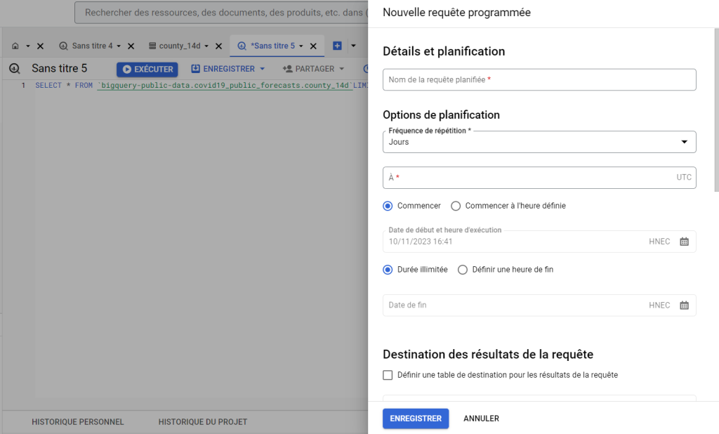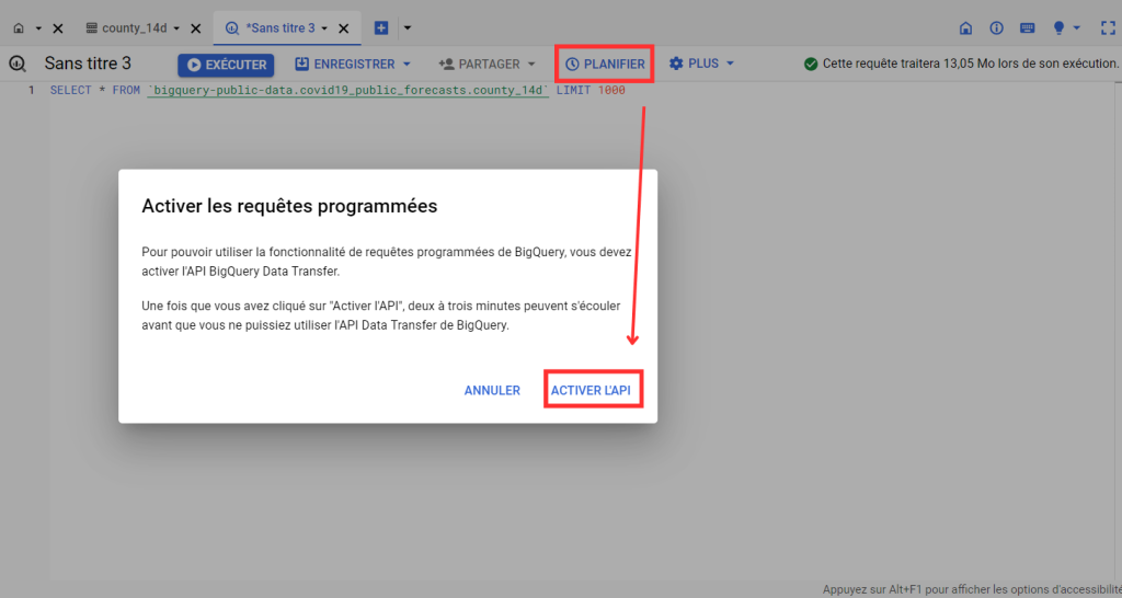 Information utile : Lors de la première planification, il sera demandé d’activer l’API BigQuery Data Transfer. Bien que ce service soit activé, le coût d’une requête programmée est identique à celle d’une requête manuelle.